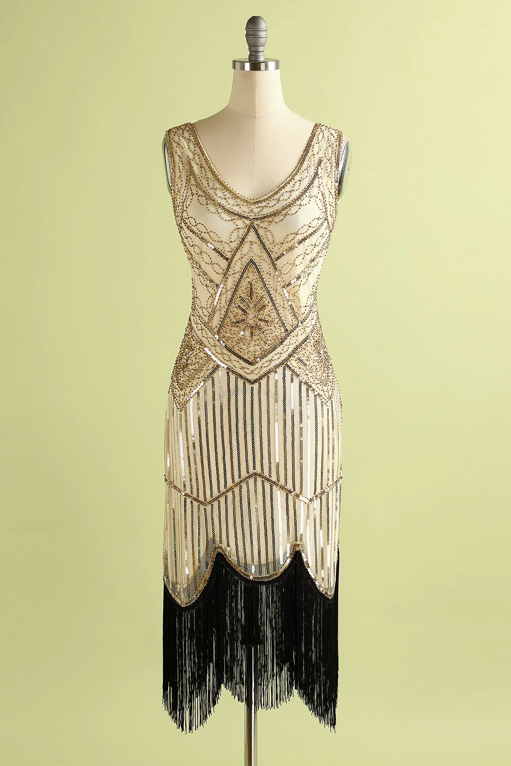 Champagnekleurige Jaren 20 franjejurk met pailletten